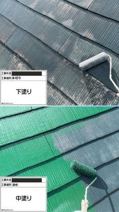 下塗り材で屋根材を補強し、上塗り塗料の密着を高めます。